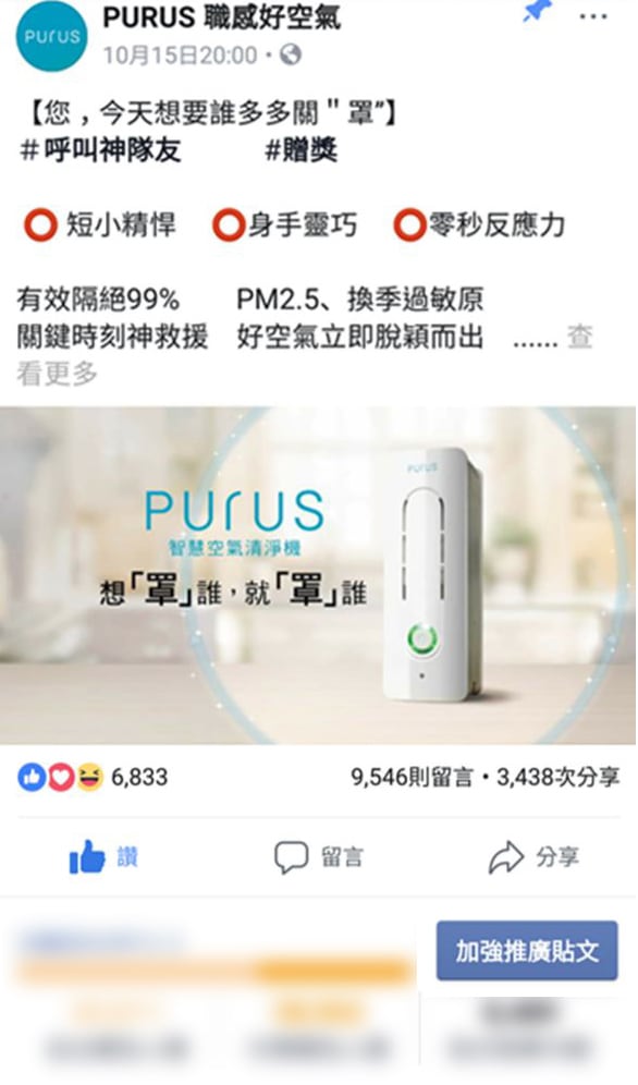 6 月 04 行銷專案合作:PURUS 創星物聯桌上型空氣清淨機 By mandy 客戶實證案例 No Comments 依照年度重點月份進行 Facebook 推廣與宣傳,如:父親節、跨年…等,並搭配內部推廣上市新品,除讓產品規格提升,隨機提供的產品說明書也同步進階翻新。 合作方式: 節慶式任務宣傳規劃:Facebook 社群經營 年度新品推出:產品說明書企劃與製作 透過推廣PURUS創星物聯桌上型空氣清...Read More
