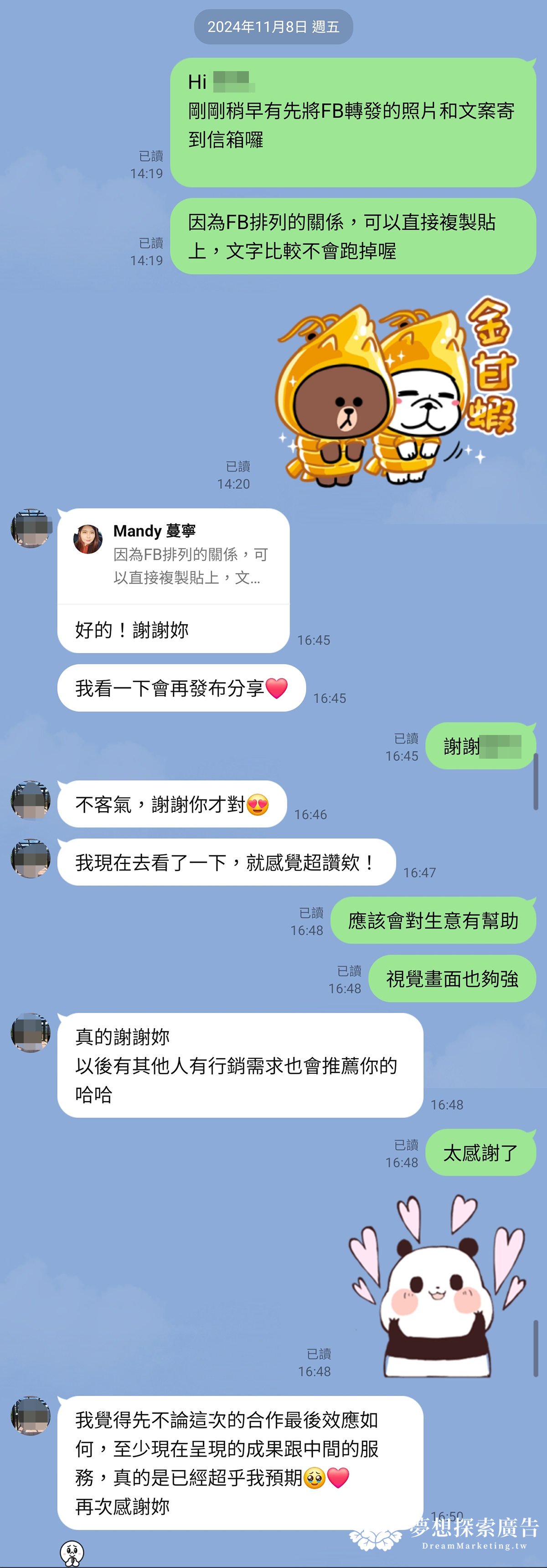 夢想探索廣告在整個官網改版專案執行過程中,隨時與客戶保持密切溝通,並從LINE對話中獲得真實、即時的反饋: