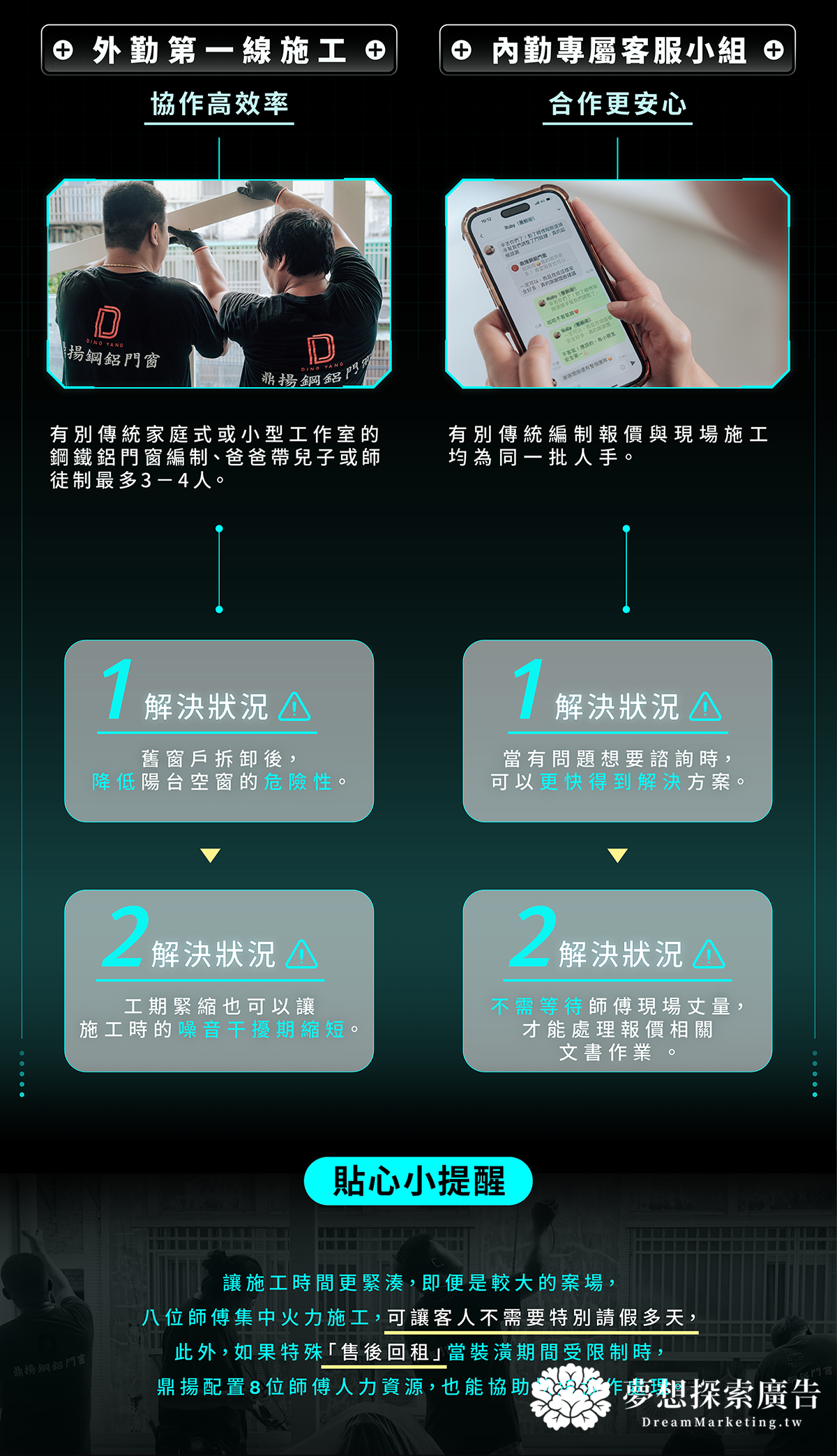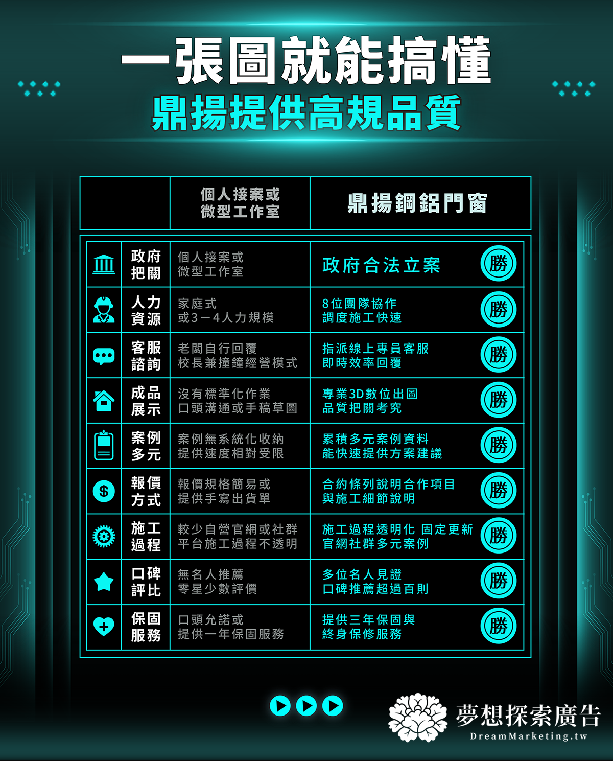 夢想探索廣告的行銷合作夥伴——鼎揚鋼鋁門窗,自創立以來始終秉持「品質第一、服務至上」的理念,專注於提供高品質鋁門窗產品。隨著市場環境變遷與消費者需求提升,鼎揚逐漸意識到,僅靠優質的產品與服務已難以全面展現品牌價值,傳統的行銷方式也無法有效溝通品牌的專業與獨特性。