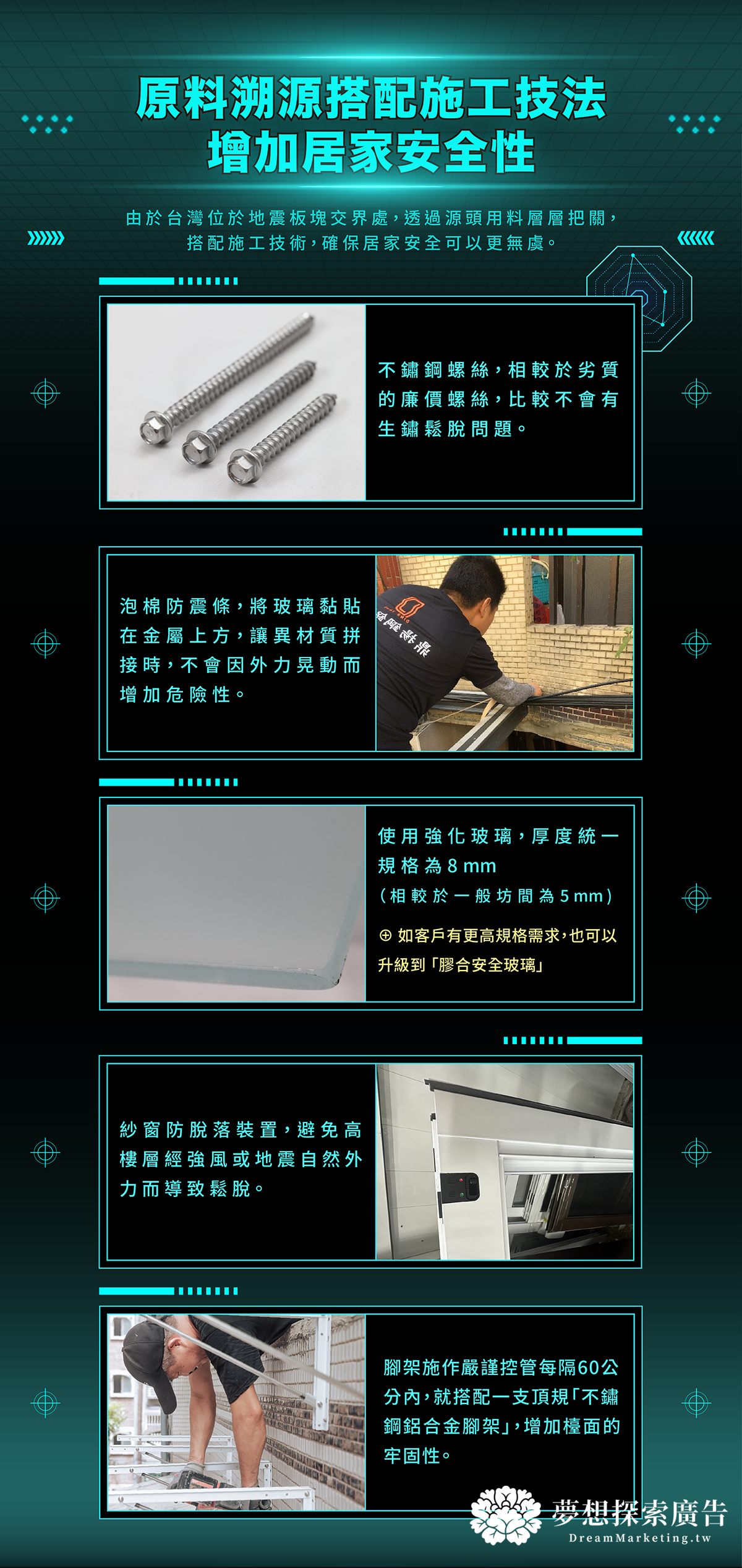 從品牌訪談、市場研究,到文案精煉與視覺整合,夢想探索廣告以一條龍的專業流程,協助鼎揚鋼鋁門窗打造出兼具識別度與吸引力的全新品牌形象。不只是設計好看,更是從核心價值出發,講出品牌屬於自己的獨特故事,進而吸引對品牌有共鳴的消費者。