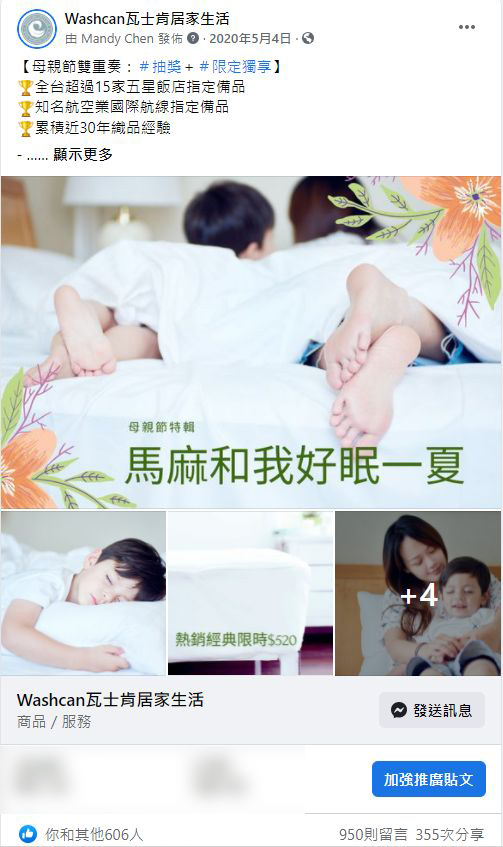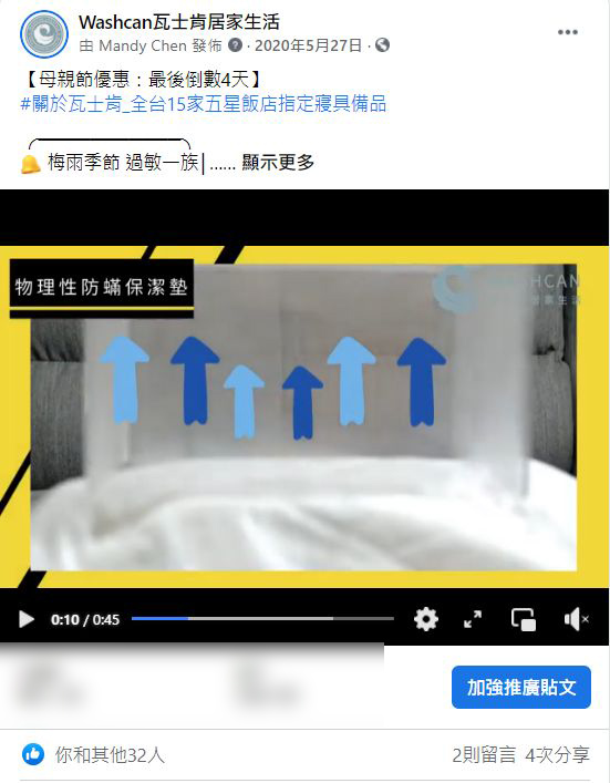 ▼下圖:安排設定贈送一百組限量口罩套,當數量大時社群便有機會快速擴散,且傳遞品牌想要溝通的美好人情味,同時埋入過往服務五星飯店備品的紡織技術,讓潛在的消費客群,能將瓦士肯品牌納入未來在採購寢具時的商家清單之一。→點擊連結立即看