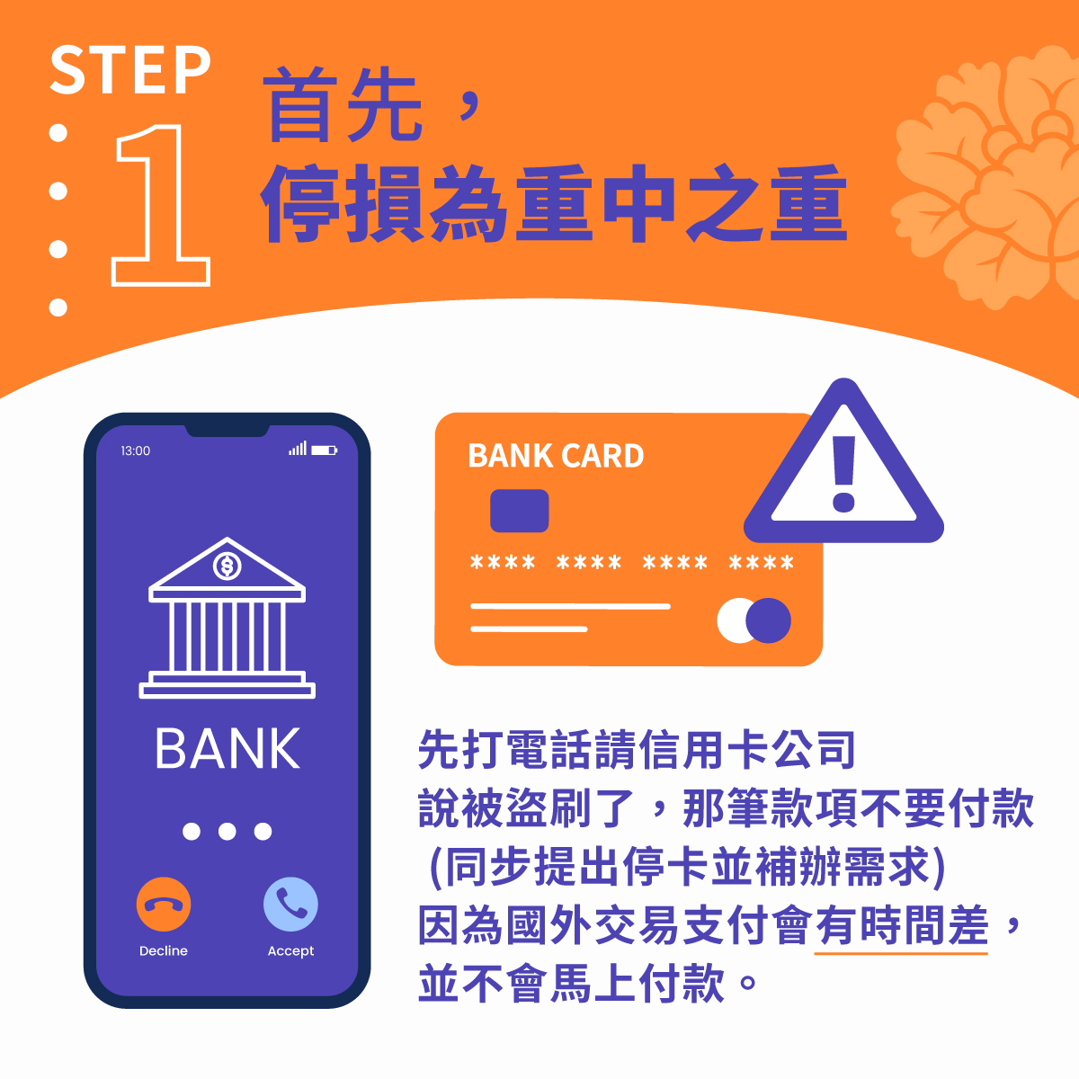 重要提醒,在發生當下就是與時間賽跑,建議能夠越快妥善回報各單位,才能將被惡意盜刷的損失降到最低