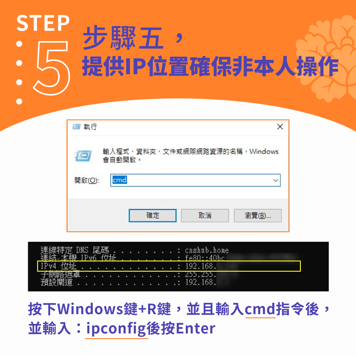 按下Windows鍵+R鍵,並且輸入cmd指令後,並輸入:ipconfig後按Enter