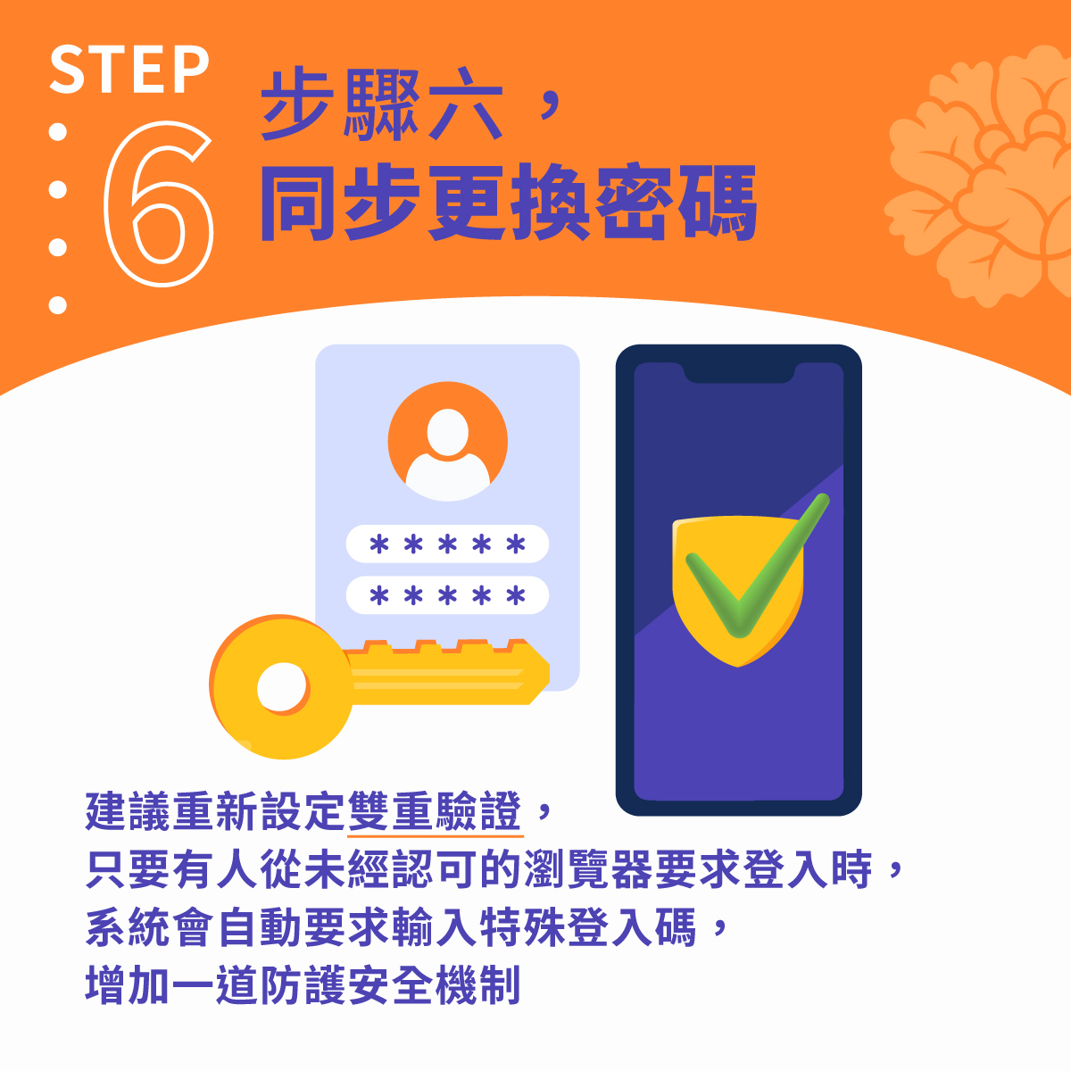 建議重新設定雙重認證,當未來有人惡意未經許可登入時,系統就會自動要求輸入特殊碼,可增加一道防護機制。
